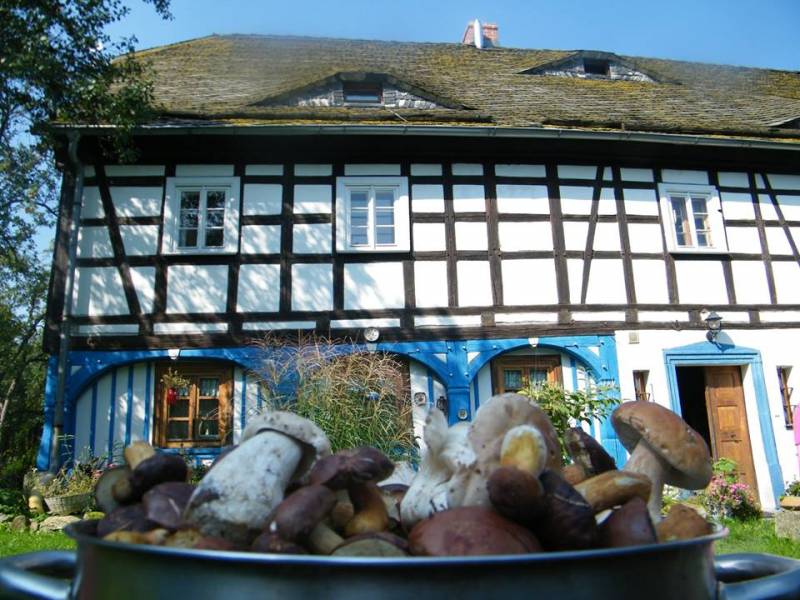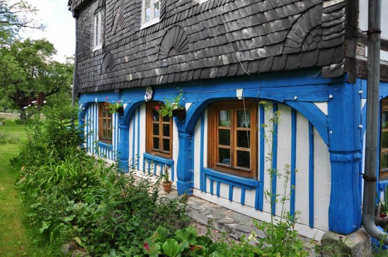wyremontowany dom przysłupowy, wybudowany około 1825 roku usytuowany w 'Artystycznej' wsi Wolimierz u podnóża Gór Izerskich.