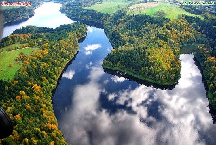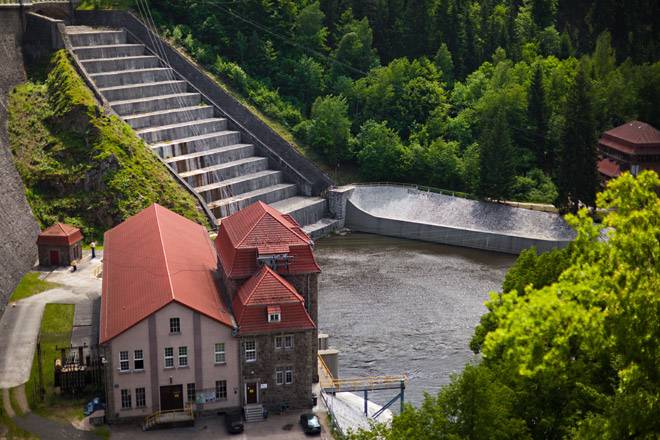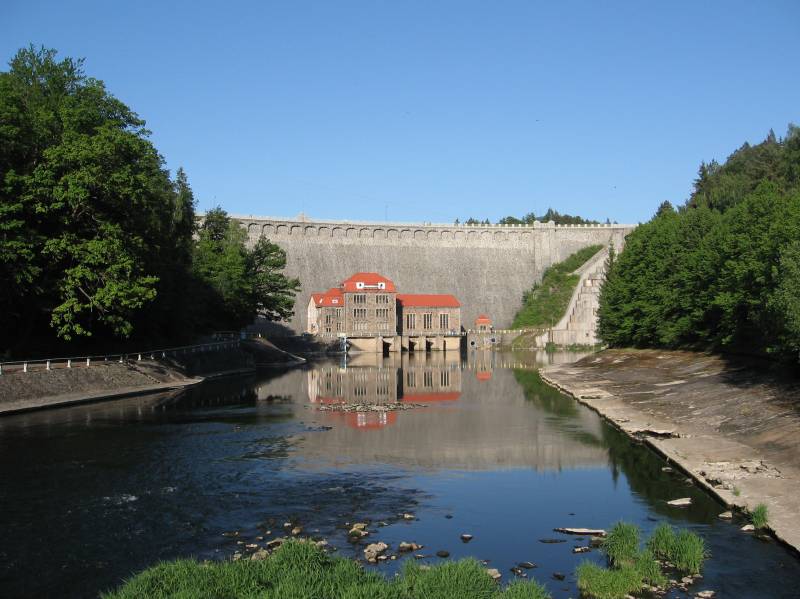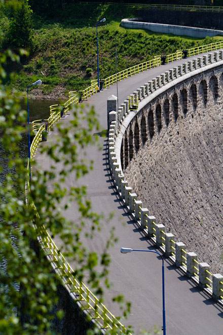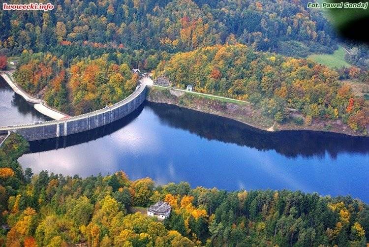 Po katastrofalnych powodziach końca XIX wieku władze Niemiec rozpoczęły w Sudetach budowę wielkich zbiorników retencyjnych. Powstałe w ten sposób jezioro o powierzchni 240 ha gormadzi 50 mln m3 wody. Sama zapora kamienna została zbudowana w latach 1904 - 1912 (jej otwarcia dokonał sam cesarz Wilhelm III) i jest najwyższą tego typu konstrukcją w Polsce (62 metry wysokości, 290 długości).